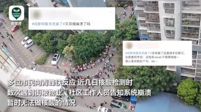 9月1日,成都部分地区的市民在社交软件上称,出现了“成都核酸检测系统崩溃”、“核酸检测点排长队”等情况,当时有不少小区在微信群中告诉大家暂时不要排队。很快,系统便恢复了正常。