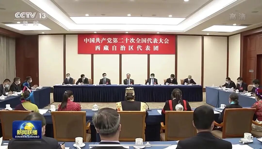 10月17日上午,汪洋来到他所在的党的二十大西藏代表团,与代表们一起讨论党的二十大报告。