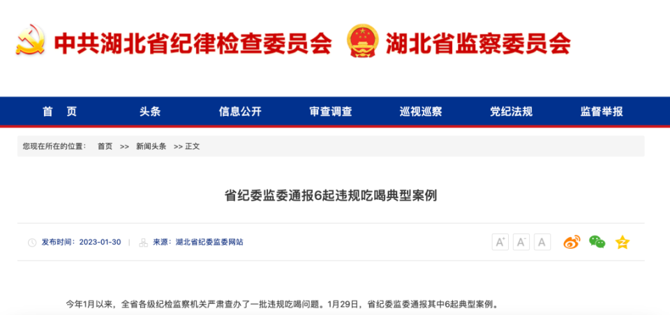 1月30日,湖北省纪委监委通报了6起违规吃喝典型案例。