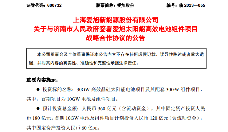 4月21日晚间,爱旭股份官宣了这笔总额达360亿元的投资计划,涉及新建30GW电池与30GW组件项目。