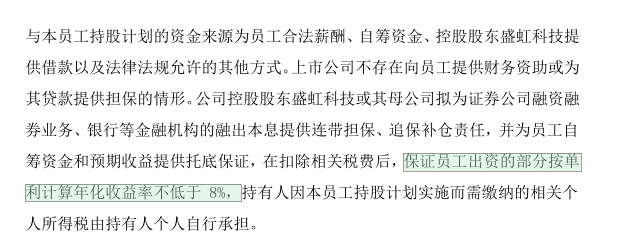 东方盛虹表示,公司员工参与本员工持股计划的资金来源为员工合法薪酬、自筹资金、控股股东盛虹科技提供借款以及法律法规允许的其他方式。上市公司不存在向员工提供财务资助或为其贷款提供担保的情形。公司控股股东盛虹科技或其母公司拟为证券公司融资融券业务、银行等金融机构的融出本息提供连带担保、追保补仓责任,并为员工自筹资金和预期收益提供托底保证,在扣除相关税费后,保证员工出资的部分按单利计算年化收益率不低于8%,持有人因本员工持股计划实施而需缴纳的相关个人所得税由持有人个人自行承担。