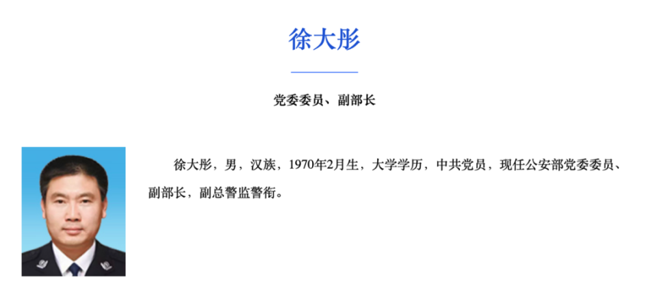 据公安部官网介绍,徐大彤,男,汉族,1970年2月生,今年53岁,大学学历,中共党员,副总警监警衔。