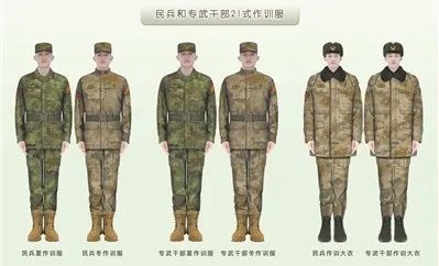 资料显示,解放军全军已于两年前陆续换发21式作训服。2021年12月30日,国防部新闻发言人谭克非介绍称,经中央军委批准,从当年冬季开始,全军部队陆续换发21式作训服、作业服。