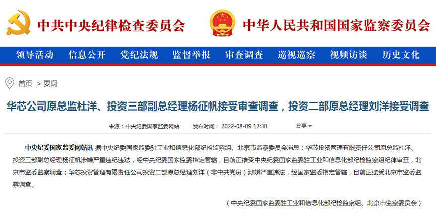 值得注意的是,据中央纪委国家监委官网2022年8月9日晚间披露,华芯投资管理有限责任公司原总监杜洋、投资三部副总经理杨征帆涉嫌严重违纪违法,正接受中央纪委国家监委驻工业和信息化部纪检监察组纪律审查,北京市监委监察调查。