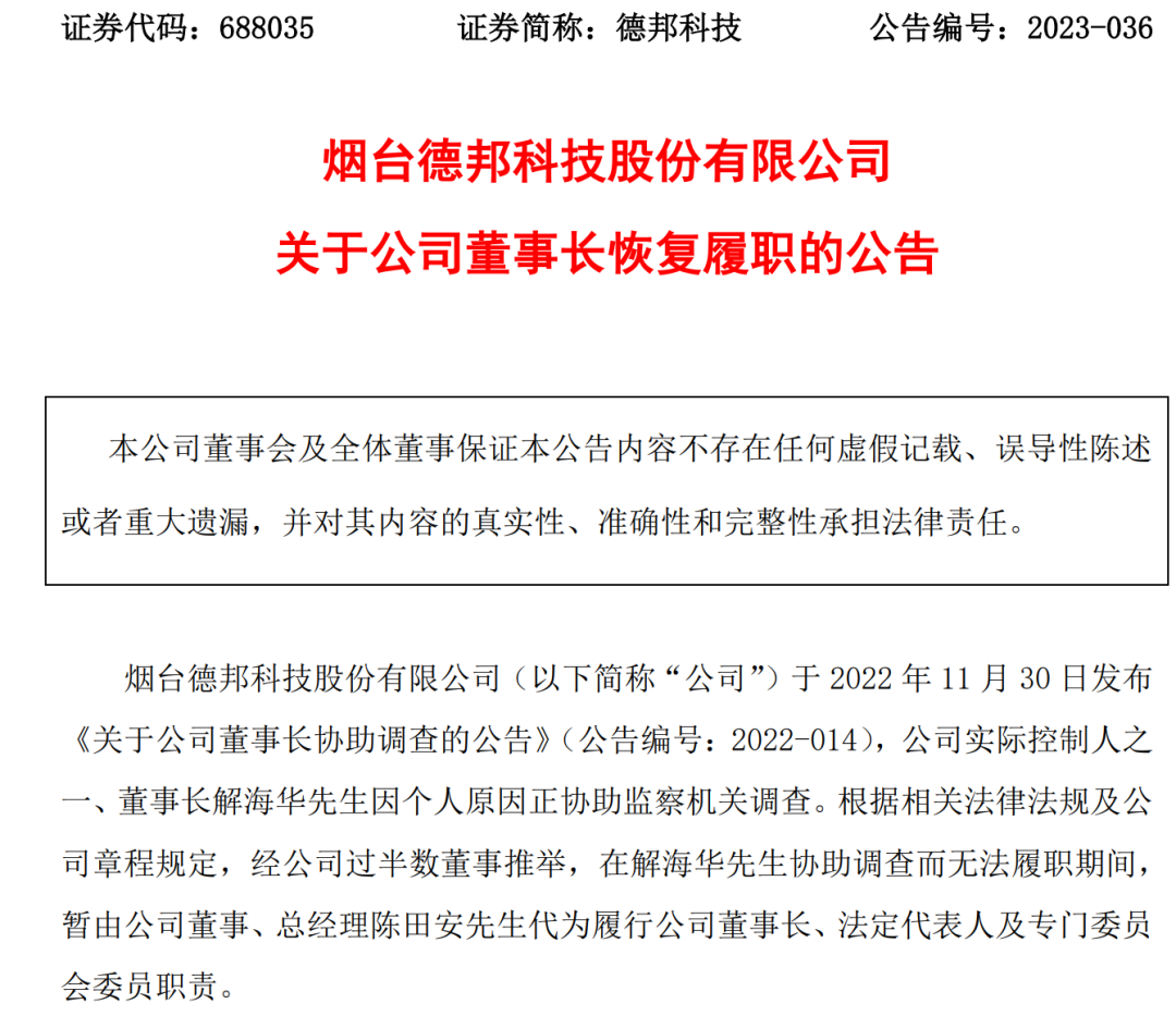 2022年11月29日晚,德邦科技公告,接到解海华配偶告知,解海华因个人原因正协助监察机关调查。在协助调查期间,解海华不能履行公司董事长、法定代表人职责。