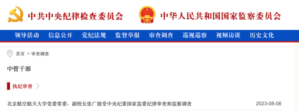 8月6日,中央纪委国家监委网站发布消息,北京航空航天大学党委常委、副校长张广涉嫌严重违纪违法,目前正接受中央纪委国家监委纪律审查和监察调查。