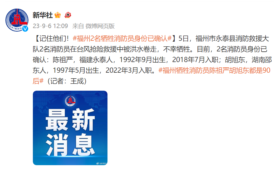 5日,福州市永泰县消防救援大队2名消防员在台风抢险救援中被洪水卷走,不幸牺牲。目前,2名消防员身份已确认:陈祖严,福建永泰人,1992年9月出生,2018年7月入职;胡旭东,湖南邵东人,1997年5月出生,2022年3月入职。(记者:王成)