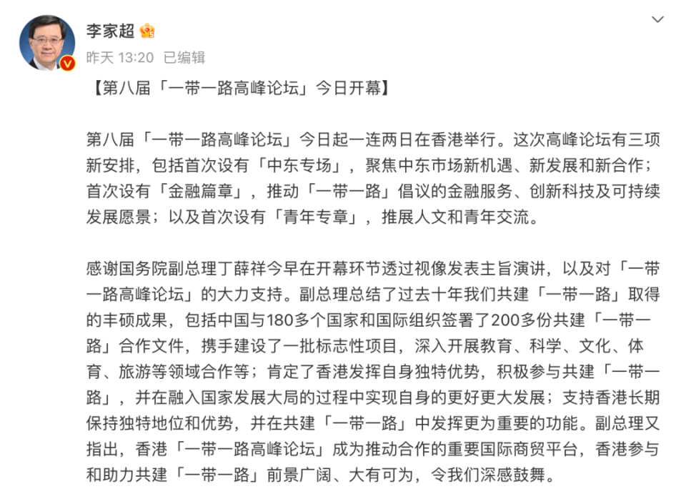 9月13日,李家超在社交平台发文,感谢国务院副总理丁薛祥今早在开幕环节透过视像发表主旨演讲,以及对“一带一路高峰论坛”的大力支持。