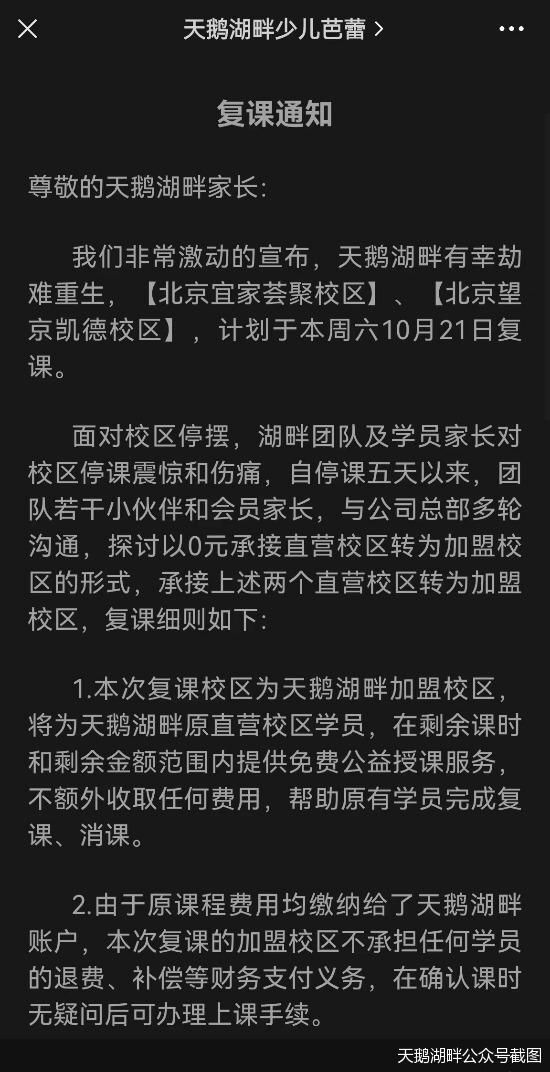 连锁企业和直营门店难逃跑路怪圈。芭蕾舞培训机构天鹅湖畔在一夜间关闭了北京12家直营门店之后,相关售后事宜有了新进展。10月19日,天鹅湖畔发布复课通知称,宜家荟聚校区及望京凯德校区将为天鹅湖畔原直营校区学员,在剩余课时和剩余金额范围内提供免费公益授课服务,上述校区转为加盟校区,但不承担任何学员的退费、补偿等财务支付义务,计划将于10月21日复课。