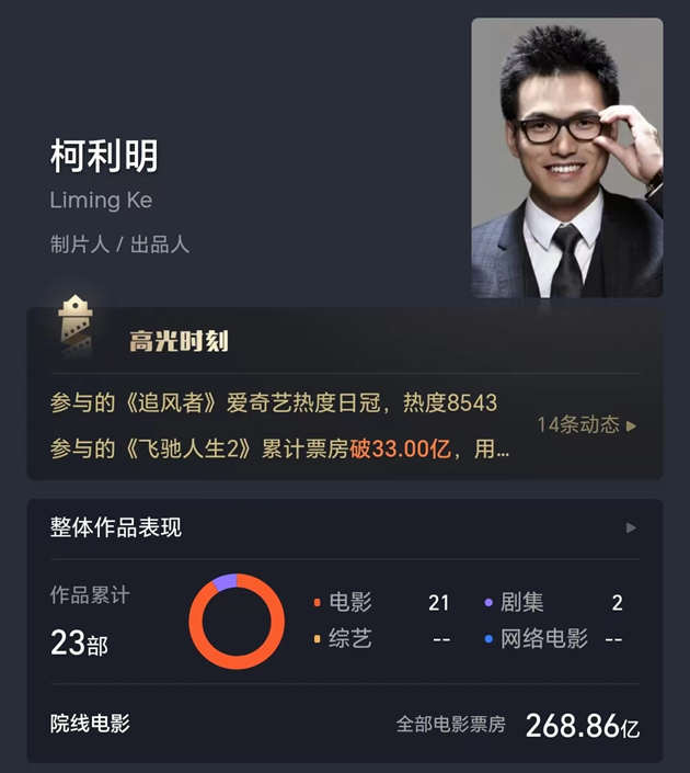 在儒意的影视投资中,柯利明扮演着决策者地位。作为影视圈内少有的专业金融投资背景出身者,柯利明对于风险控制、投入产出有着极高的要求。