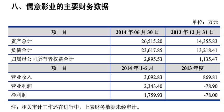 儒意影业2013年的收入为870万元,亏损78亿元,2014年上半年营业收入3093万元,净利润1760万元。当时的儒意影业正处于影视项目变现的起点,柯利明等人许下高额业绩承诺,儒意影业2014年度至2016年度净利润累计需不低于3.9亿元。