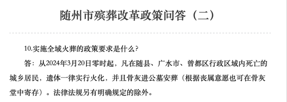从2024年3月20日零时起,凡在随县、广水市、曾都区行政区域内死亡的城乡居民,遗体一律实行火化,并且骨灰进公墓安葬(根据丧属意愿也可在骨灰堂中寄存)。法律法规另有明确规定的除外。
