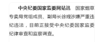 中央纪委国家监委网站5月25日通报,国家烟草专卖局党组成员、副局长接受中央纪委国家监委纪律审查和监察调查。