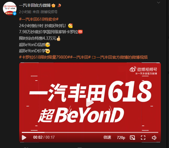 6月18日,一汽丰田官方微博发布消息,即日举行24小时限时特卖会。