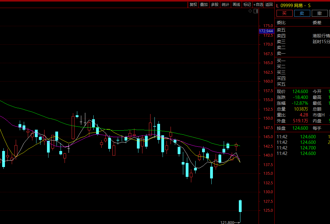 承接昨夜美股跌势,8月23日港股网易继续大幅低开,盘中股价一度下跌逾14%最低至121.8港元。