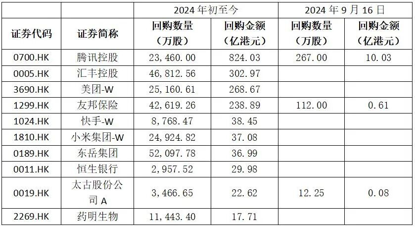 互联网、金融及医药行业龙头公司仍为回购主力。截至9月16日,汇丰控股(00005.HK)、美团-W(03690.HK)、友邦保险年内回购金额超百亿港元,分别为303亿港元、269亿港元、239亿港元。快手、小米集团、东岳集团、恒生银行、太古股份公司、药明生物、长实集团、百胜中国、石药集团等公司回购金额均已超过10亿港元。