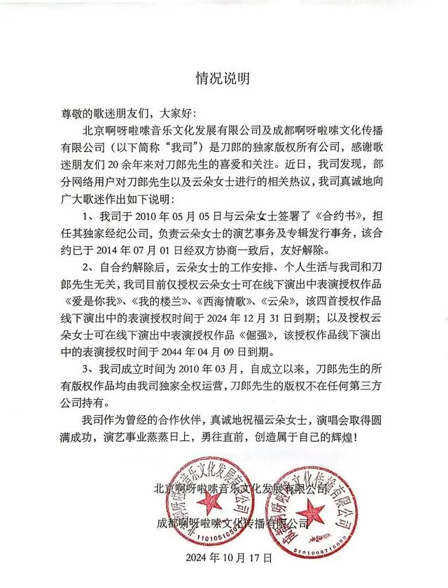 《情况说明》中还表示,自合约解除后,云朵的工作安排、个人生活与公司和刀郎无关,公司目前仅授权云朵可在线下演出中表演授权作品《爱是你我》《我的楼兰》《西海情歌》《云朵》,该四首授权作品线下演出中的表演授权时间于2024年12月31日到期;以及授权云朵可在线下演出中表演授权作品《倔强》,该授权作品线下演出中的表演授权时间于2044年4月9日到期。