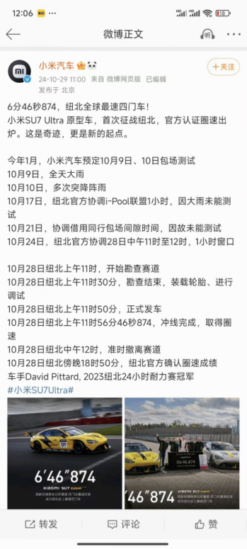 10月28日,小米SU7 Ultra原型车首次征战纽北,圈速成绩为6分46秒874,成为纽北全球最速四门车。由此,业内普遍认为,作为小米打造的顶级性能车,小米SU7 Ultra原型车打破了国外豪华品牌垄断的纽北圈速纪录,让中国车第一次站在了世界之巅。