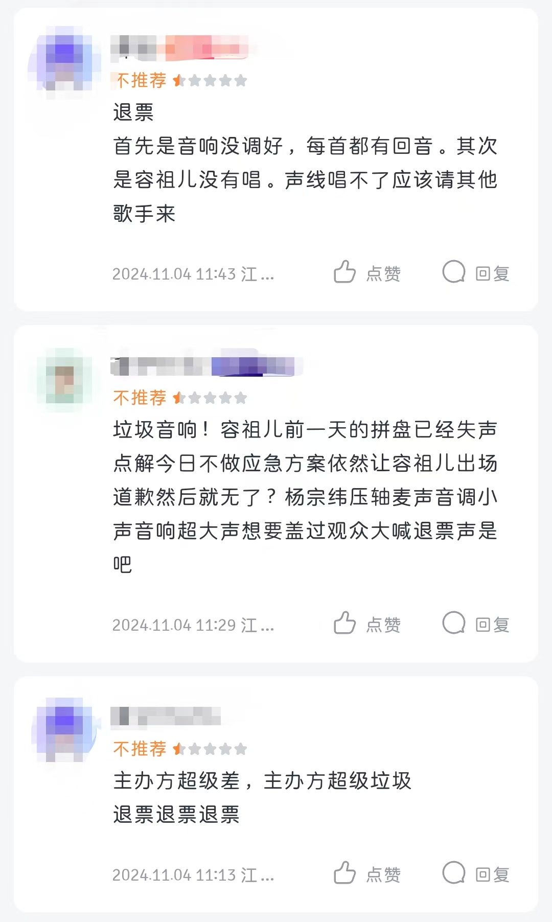 4日记者联系到一位现场观众,该观众认为主办方肯定不是2号演出前才知道容祖儿失声唱不了的,“她1号怀化就没唱,但那一场基本都是去看王力宏的,所以才没闹起来。”记者查询到11月1日晚,2024怀化明星演唱会在湖南怀化举行,官宣阵容包括王力宏、容祖儿、刘聪、王铮亮、蔡旻佑等华语乐坛知名歌手,不过社交平台上也有人发帖吐槽这一场拼盘演唱会:“退钱!祖儿感冒唱不了为什么现场才说,一首都没有唱,王力宏也只唱了四首,我的钱不是钱吗?”但的确也有人并不在意,“还好我是去看王铮亮和刘聪的,他们唱得都挺久,太值了。”在这条发布于11月1日晚的吐槽帖下,即有网友在评论区猜测“那她明天来江门也唱不了吧,太坑了……”