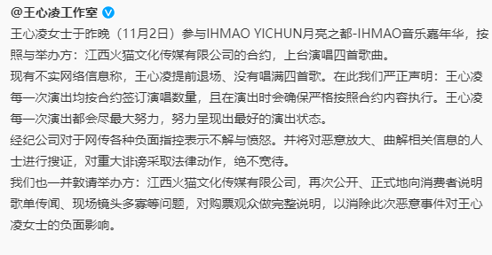 王心凌工作室发布声明王心凌的每一场演出均按照合约签订的演唱数量并在演出时按照合约严格执行,针对网络上的重大诽谤将会采取法律行动,工作室并督促主办方火猫再次公开向消费者说明歌单传闻、现场镜头多寡问题,消除对王心凌的负面影响。