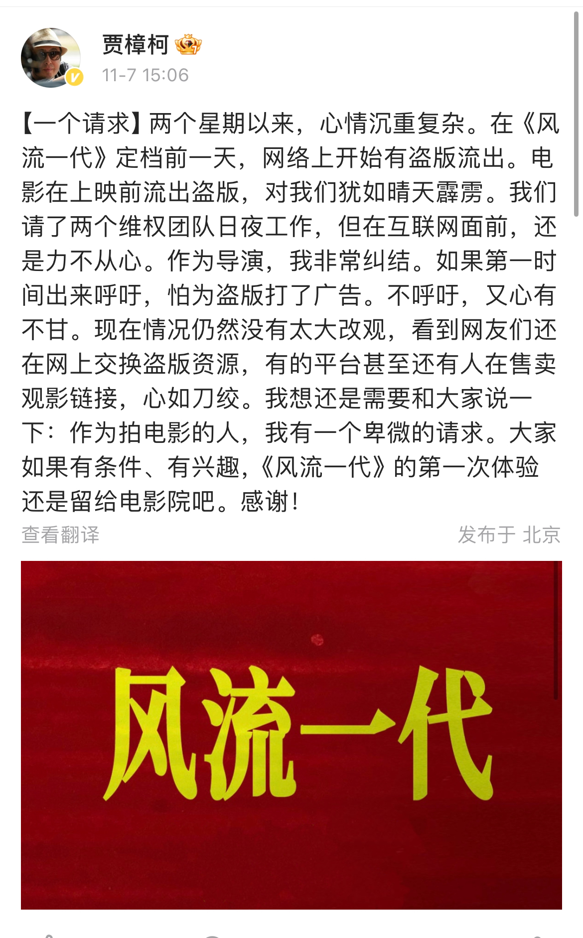 然而电影还没上映,贾樟柯却遇到了烦心事。近日,贾樟柯在微博发文,请求观众不要观看网络上盗版的《风流一代》,呼吁有条件和有兴趣的观众到影院观影。