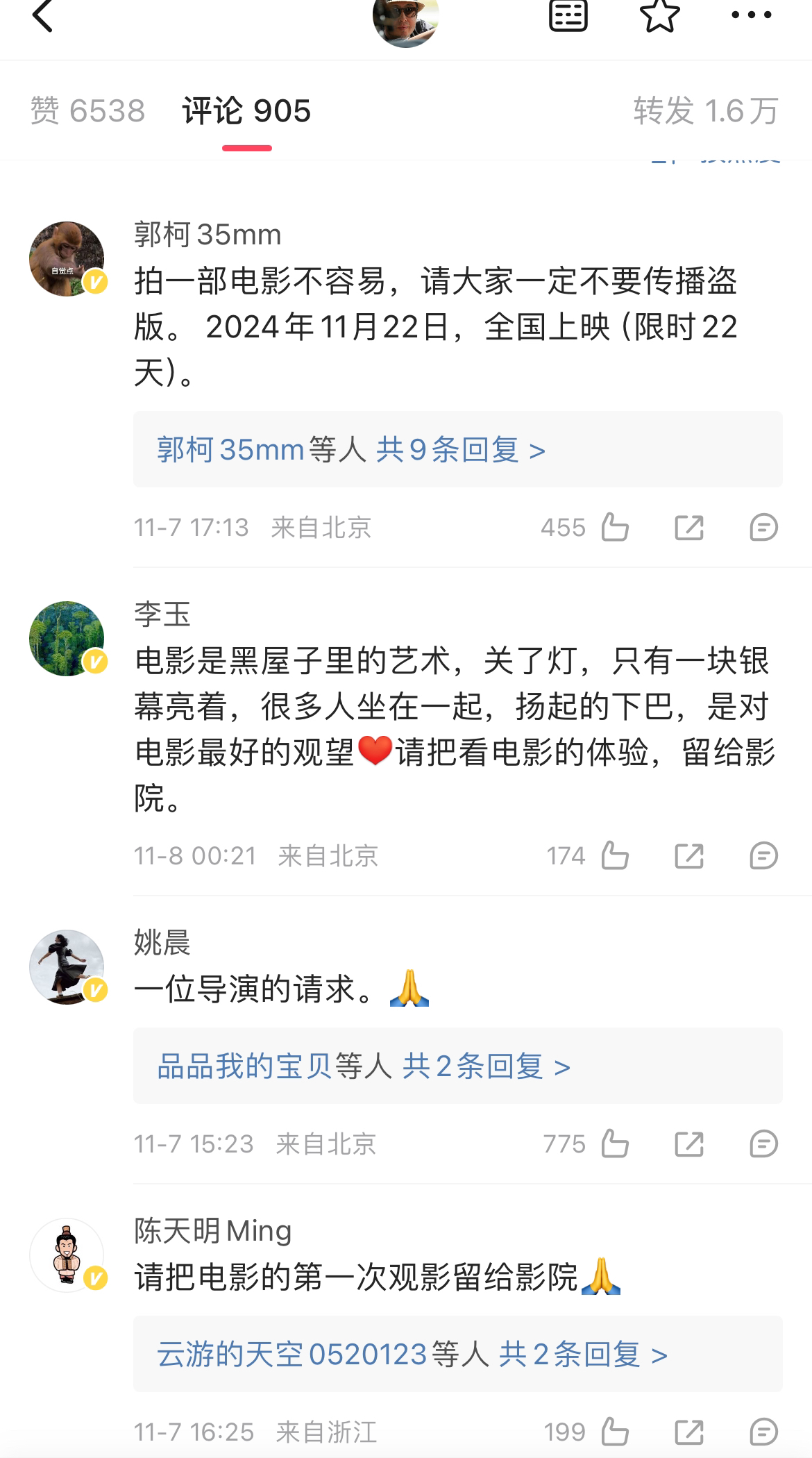 不少影视行业同行对贾樟柯发起响应,导演李玉在评论区留言,”电影是黑屋子里的艺术,关了灯,只有一块银幕亮着,很多人坐在一起,扬起的下巴,是对电影最好的观望。请把看电影的体验,留给影院。“演员姚晨在评论区回复,“一位导演的请求。”演员陈天明则表示,“请把电影的第一次观影留给影院。”