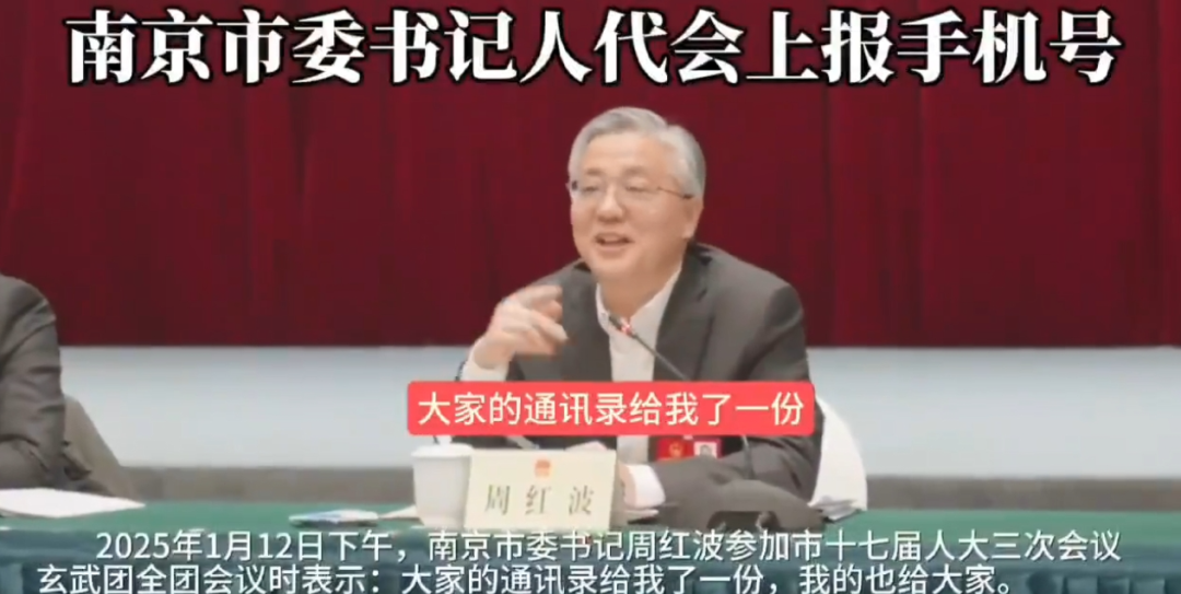 《扬子晚报》新媒体账号就此发布视频披露,南京市人代会期间,南京市委书记周红波参加玄武团全团会议时说,“大家的通讯录给我了一份,刚才我的也给大家了。”“再补充一句,电话号码和微信号码一样。”