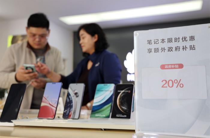3月9日,消费者在山东省滨州市阳信县的一家手机商店内选购手机。新华社发(初宝瑞 摄)