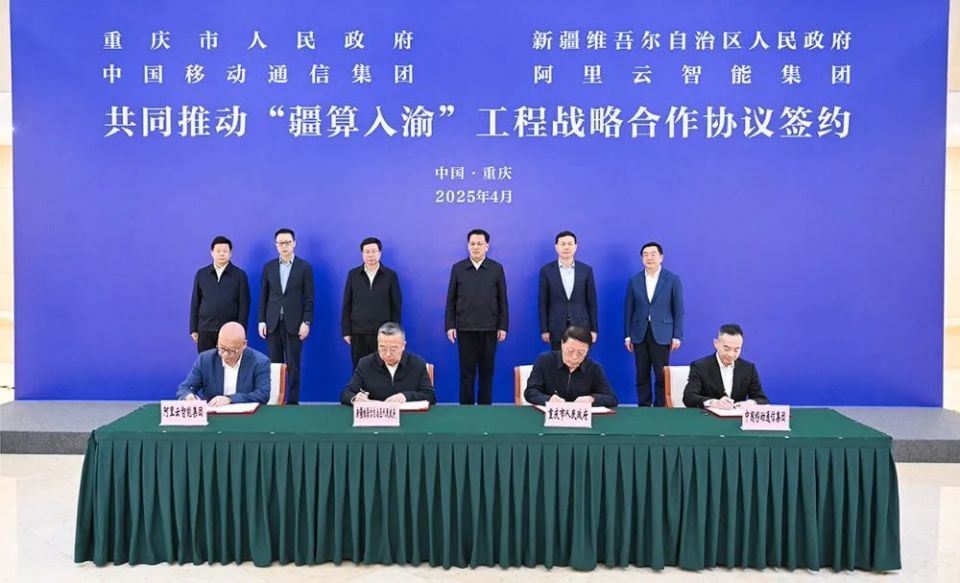 4月23日下午,重庆市人民政府、新疆维吾尔自治区人民政府、中国移动通信集团、阿里云智能集团,签署共同推动“疆算入渝”工程战略合作协议。