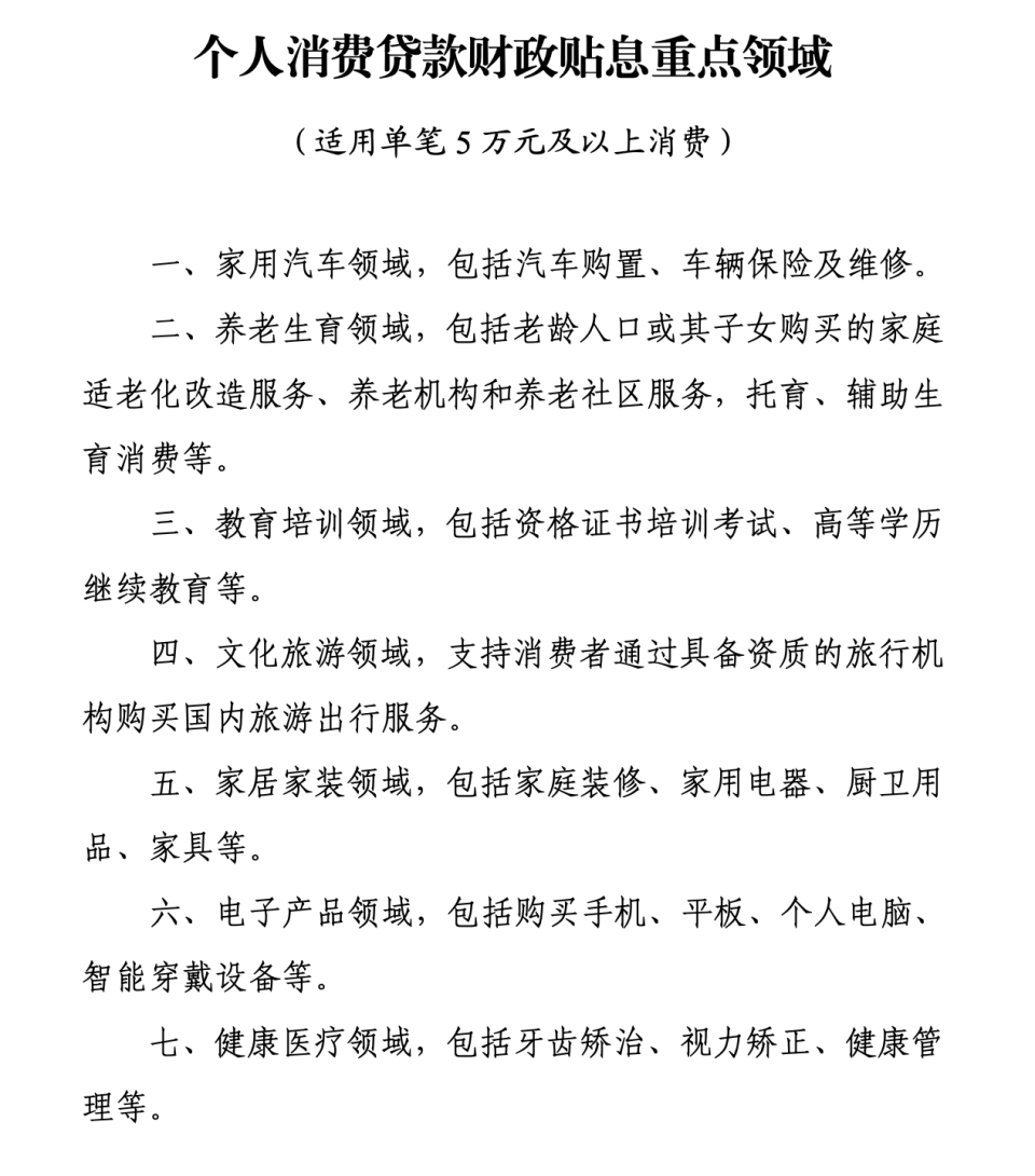 《个人消费贷款财政贴息政策实施方案》明确的支持范围和贴息标准: