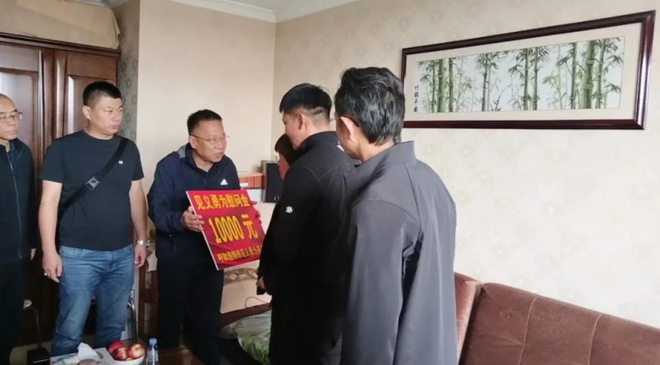 10月3日呼和浩特市委政法委呼和浩特市见义勇为基金会等单位前往慰问黄启东家属市见义勇为基金会工作人员向黄启东家属发放1万元见义勇为慰问金。