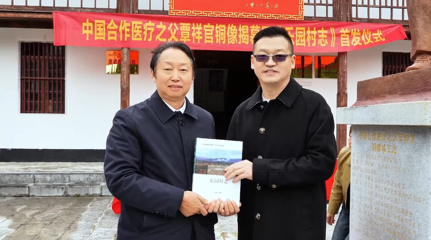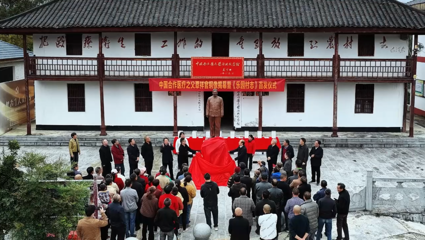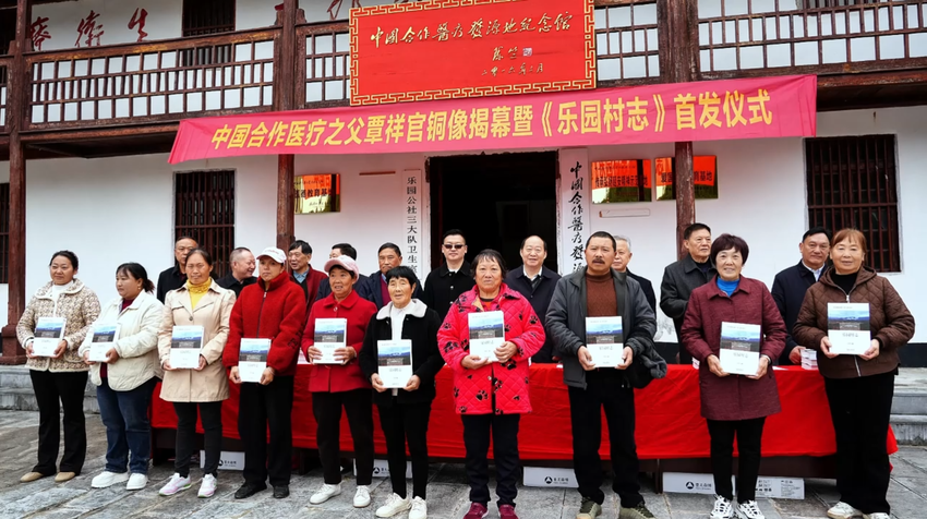 据了解,覃祥官铜像由湖北亿源建筑有限公司捐资铸造,以铭记覃祥官及合作医疗首创团队的贡献。铜像高193.3厘米,底座厚9厘米,基座厚27厘米,总高202.3厘米,分别寓意覃祥官的出生年份、铜像铸造年份等信息。同时,由中国合作医疗发源地纪念馆馆长李茂清历时四十多年搜集资料并编纂的《乐园村志》也在仪式上首发。