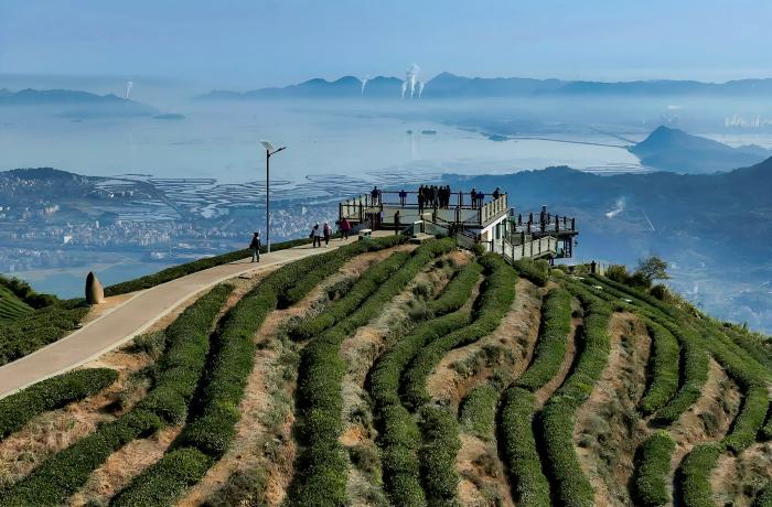 游客在位于福州市连江县炉峰山上的观景平台观赏山海风景(12月6日摄,无人机照片)。新华社记者 魏培全 摄