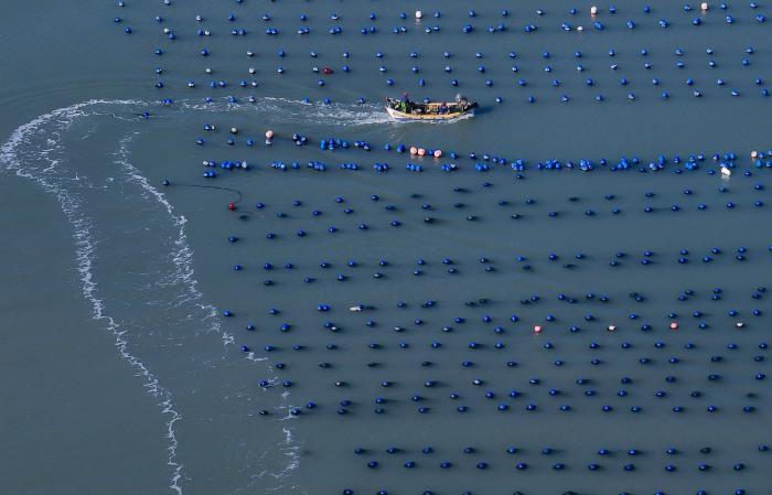 一艘渔船在福建省连江县黄岐半岛海域海上养殖区航行(12月6日摄,无人机照片)。新华社记者 魏培全 摄