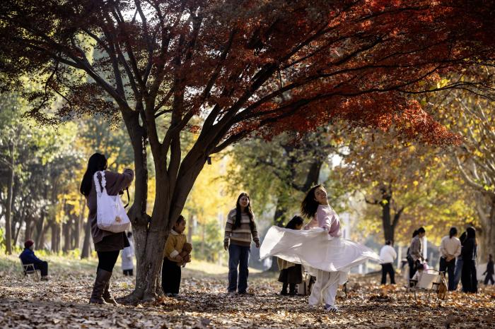 12月7日,游人在江苏南京中山植物园观赏枫叶。新华社发(杨素平摄)