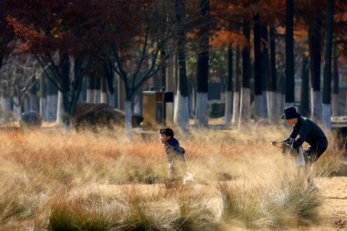 12月7日,市民在浙江义乌骆宾王公园游玩拍照。新华社发(龚献明摄)
