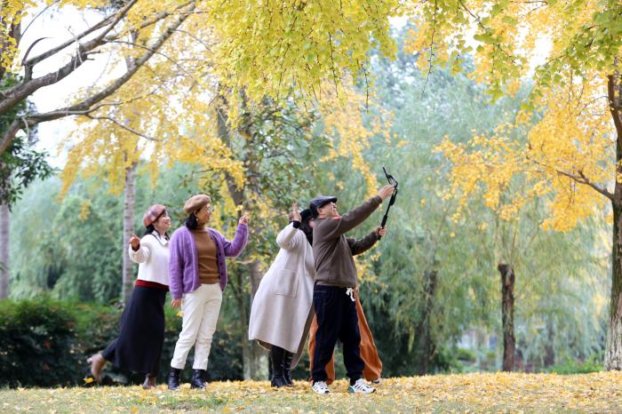 12月6日,市民在四川省乐山市一处银杏树下游玩拍照。新华社发(李华时摄)