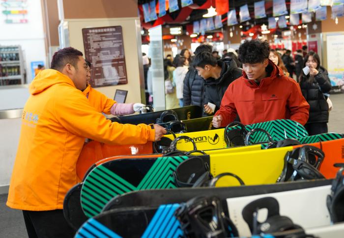 12月8日,在阿坝州汶川县羌人谷滑雪场,游客在装备区取滑雪装备。