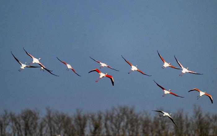 视窗|江苏东台:火烈鸟飞抵条子泥湿地越冬