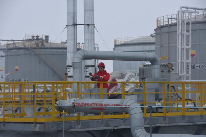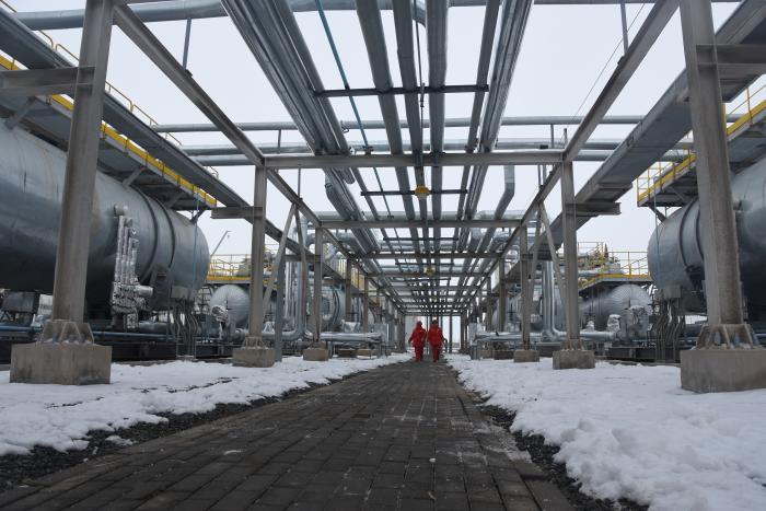 12月8日,在新疆吉木萨尔国家级陆相页岩油示范区,中国石油新疆油田页岩油联合站员工在巡检设备。