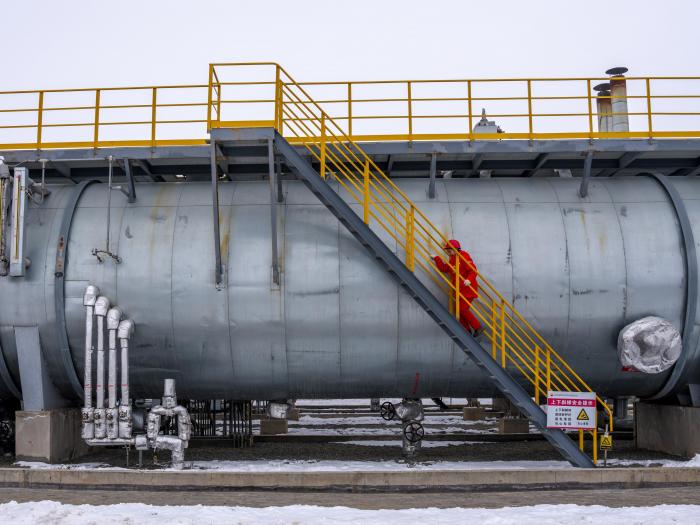 12月8日,在新疆吉木萨尔国家级陆相页岩油示范区,中国石油新疆油田页岩油联合站员工在巡检设备。新华社记者 顾煜 摄