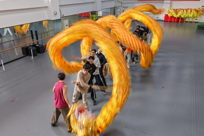 重庆铜梁龙艺术团团长蔡明灿介绍,铜梁龙舞最开始只有几个动作,后来逐步融入音乐、舞蹈、戏曲、杂技等元素,演变出数百个动作,竞技舞龙又将体育比赛和表演相结合,兼具动作难度、力量与美感。12月7日,重庆铜梁龙艺术团竞技舞龙队队员在进行日常训练。