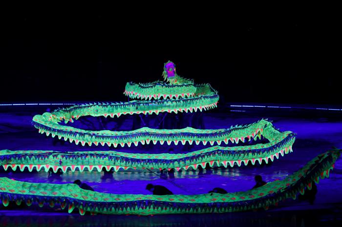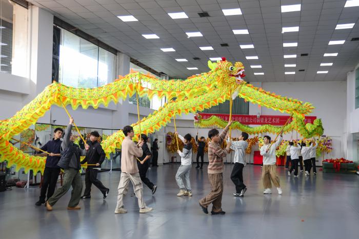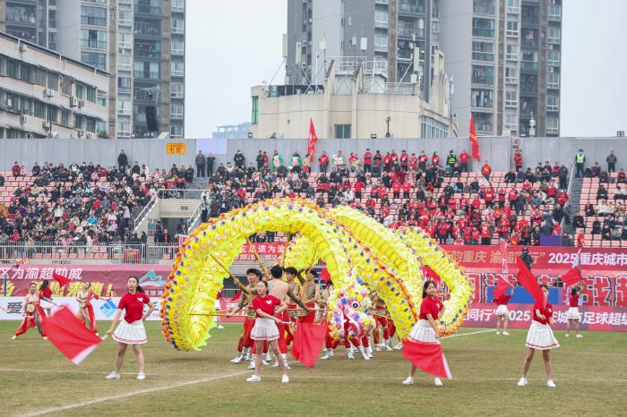 近年来,铜梁区深挖龙文化内涵,出台关于龙舞传承发展的系列政策,建立起国家、市、区和镇街四级名录保护体系,形成上百人的传承人梯队,全区每所中小学校均有舞龙队,开设龙舞特色课堂,为铜梁龙舞储备人才。12月6日,重庆铜梁龙艺术团竞技舞龙队队员在“渝超”赛场进行暖场表演。