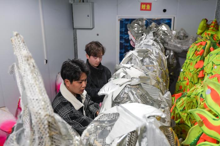“铜梁龙舞如今在年轻人手中得到更好的传承和发展,让更多人感受到龙舞所焕发的青春活力。”蔡明灿说。12月6日,在铜梁区玄天湖龙舞广场,重庆铜梁龙艺术团竞技舞龙队队员魏烨(左)、秦新松在演出前检查表演道具。