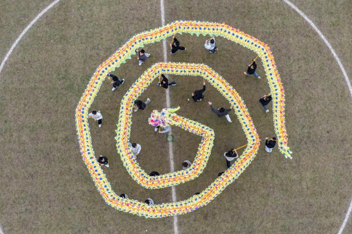 “跑的时候注意站位,把身形稳住!慢八字舞龙的时候龙头要注意照顾好龙尾的节奏,不要抢!”重庆铜梁龙艺术团训练室里,团长蔡明灿正在一旁悉心指导舞龙队队员进行竞技舞龙训练。12月7日,重庆铜梁龙艺术团竞技舞龙队队员在进行日常训练(无人机照片)。