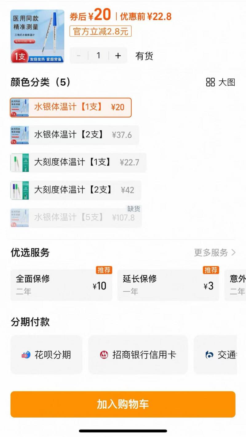 北青报记者注意到,在电商平台上,不少网店虽然在商品里打出了“水银体温计”的字样,但是商品实际销售页面则均为“无汞体温计”或电子体温计。多个店铺客服称,最近几日购买水银体温计的顾客明显增多,如果无法下单就表示已经无货,是否补货也还暂时不清楚。