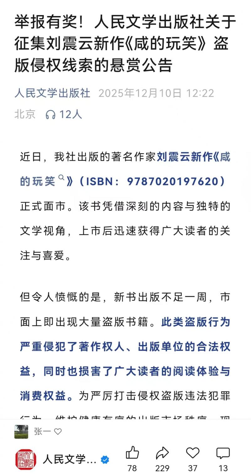 刘震云新作《咸的玩笑》遭盗版 人文社发举报有奖公告