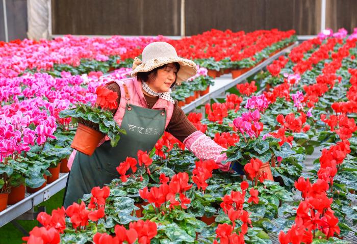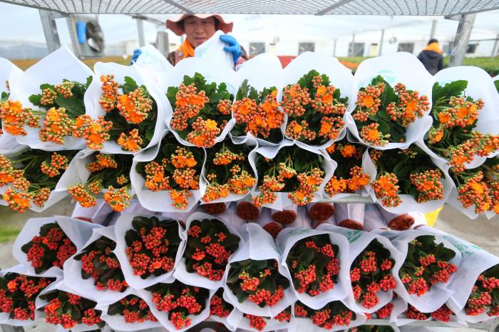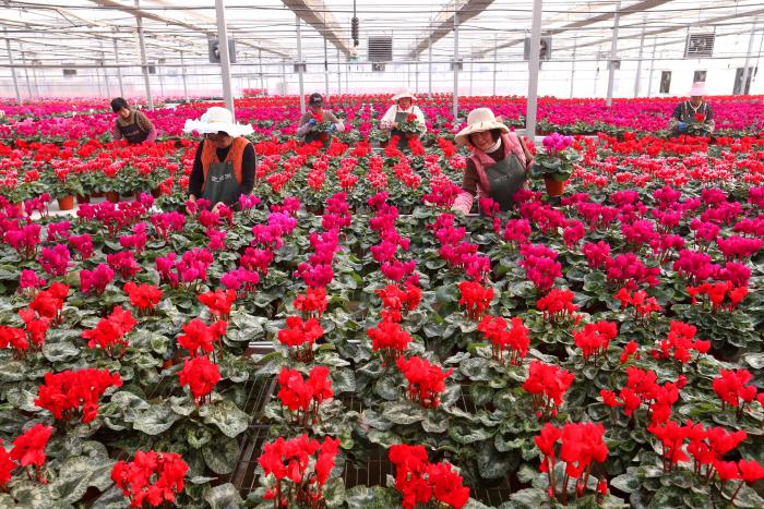 近日,山东省青岛市即墨区灵山街道花卉大棚里一片忙碌,种植户们忙着管护和销售花卉。
