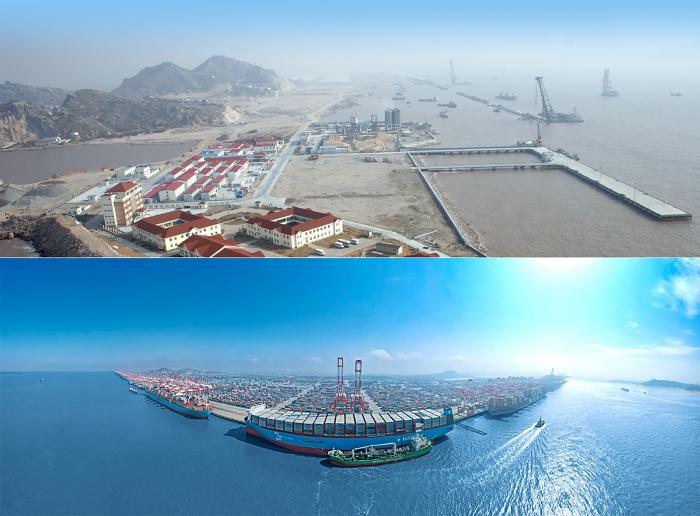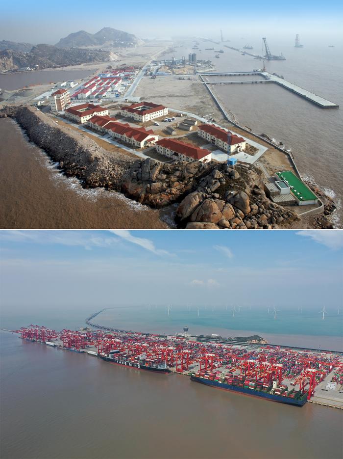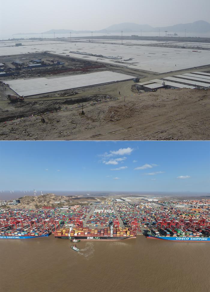 拼版照片:上图为2005年3月1日拍摄的上海洋山港一二期工程;下图为2025年12月8日无人机拍摄的上海洋山港一二期码头。