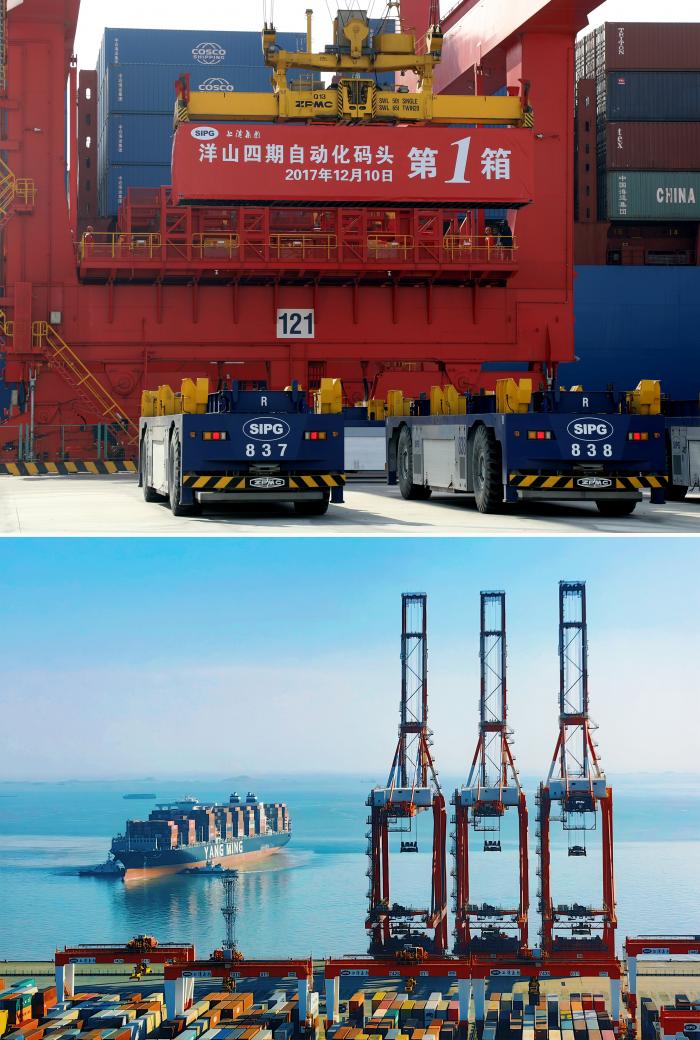 自动化码头在人员减少70%的同时综合效率提高30%,且人均劳动生产率为传统码头两倍以上。拼版照片:上图为2005年1月16日拍摄的上海洋山港一二期工程(新华社发);下图为2022年9月23日无人机拍摄的上海洋山港四期自动化码头(新华社记者 丁汀 摄)。